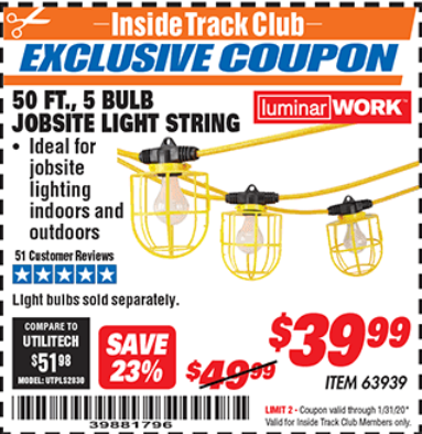 ITC 50 FT., 5 BULB JOBSITE LIGHT STRING Lot No. 63939 Expired: 1/31/20 - $39.99 Coupon Code: '39881796'