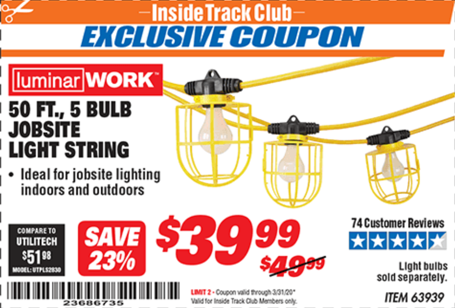 ITC 50 FT., 5 BULB JOBSITE LIGHT STRING Lot No. 63939 Expired: 3/31/20 - $39.99 Coupon Code: '23686735'