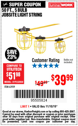 50 FT., 5 BULB JOBSITE LIGHT STRING Lot No. 63939 Expired: 11/10/19 - $39.99 Coupon Code: '95505824'