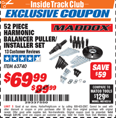 ITC 52 PIECE HARMONIC BALANCER PULLER/INSTALLER SET Lot No. 63740 Expired: 6/30/18 - $69.99 Coupon Code: '74422936'