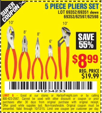 5PIECE PLIERS SET Lot No. 62598/69351/69352/69353/62597 Expired: 8/17/15 - $8.99 Coupon Code: '20094971'