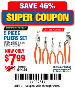 5PIECE PLIERS SET Lot No. 62598/69351/69352/69353/62597 Expired: 9/11/17 - $7.99 Coupon Code: '44982714'