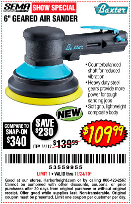 6" GEARED AIR SANDER Lot No. 56512 Expired: 11/24/19 - $109.99 Coupon Code: '53559955'
