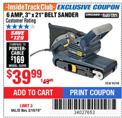 ITC 6 AMP, 3" X 21" BELT SANDER Lot No. 94748 Expired: 3/19/19 - $39.99 Coupon Code: '34027653'