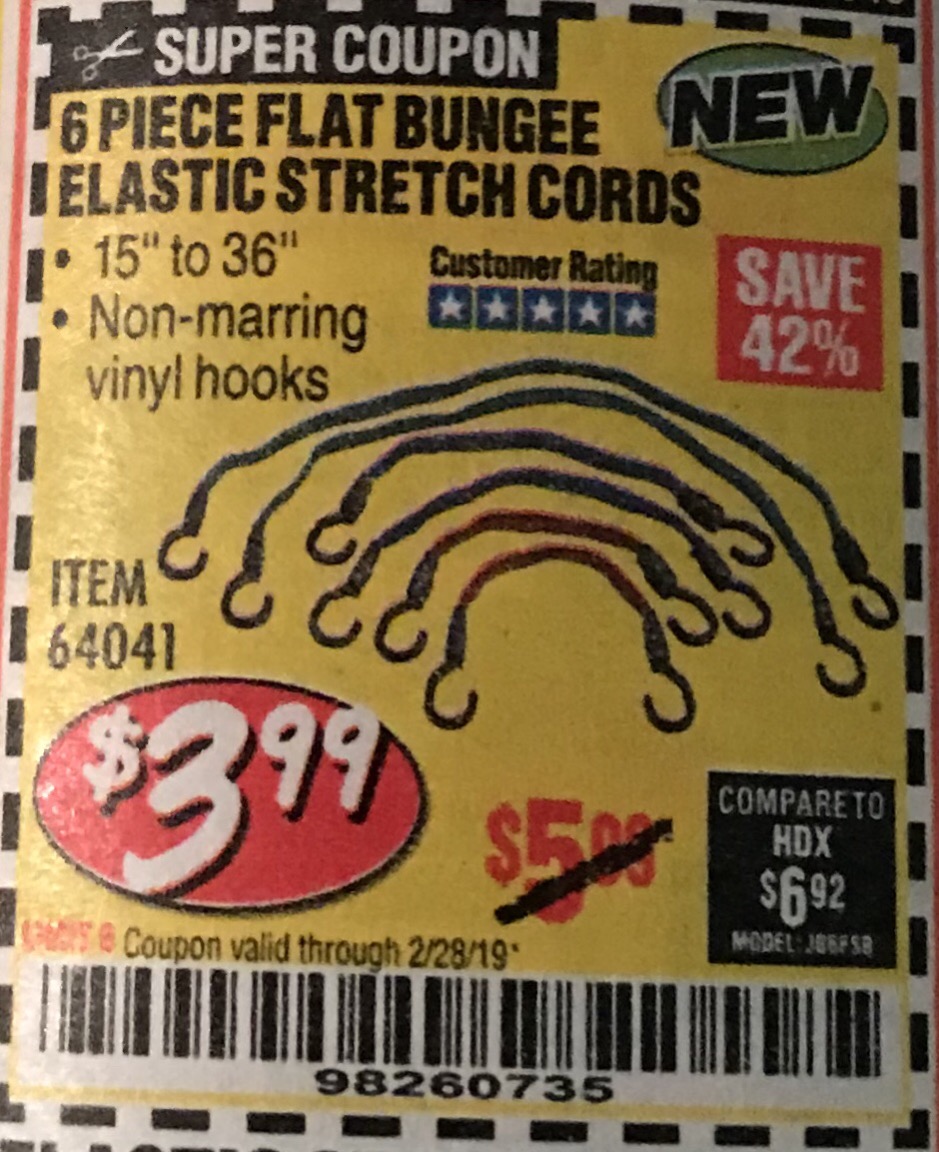 6 PIECE FLAT BUNGEE ELASTIC STRETCH CORDS Lot No. 64041 Expired: 2/28/19 - $3.99 Coupon Code: '98260735'