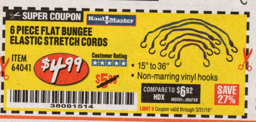 6 PIECE FLAT BUNGEE ELASTIC STRETCH CORDS Lot No. 64041 Expired: 3/31/19 - $4.99 Coupon Code: '38081514'