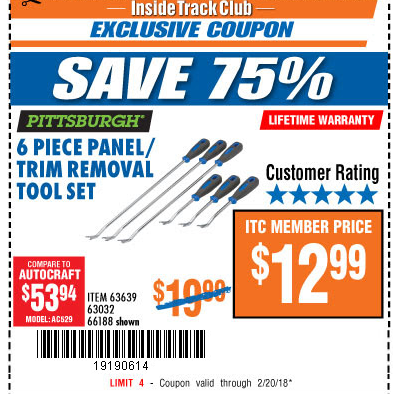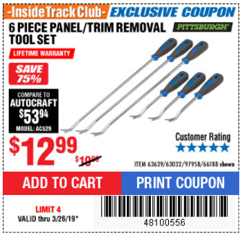 ITC 6 PIECE PANEL/TRIM REMOVAL TOOL SET Lot No. 66188 Expired: 3/26/19 - $12.99 Coupon Code: '48100556'