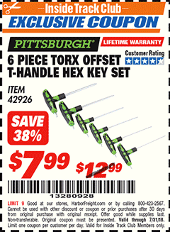 ITC 6 PIECE TORX OFFSET T-HANDLE HEX KEY SET Lot No. 42926 Expired: 7/31/18 - $7.99 Coupon Code: '13280928'