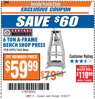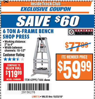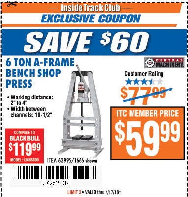 ITC 6 TON A-FRAME BENCH SHOP PRESS Lot No. 12486699 Expired: 12/26/17 - $59.99 Coupon Code: '17979543'