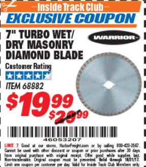 ITC 7" TURBO WET/DRY MASONRY DIAMOND BLADE Lot No. 68882 Expired: 10/31/17 - $19.99 Coupon Code: '46053207'