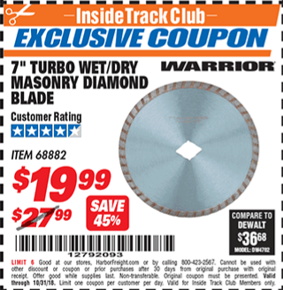 ITC 7" TURBO WET/DRY MASONRY DIAMOND BLADE Lot No. 68882 Expired: 10/31/18 - $19.99 Coupon Code: '12792093'