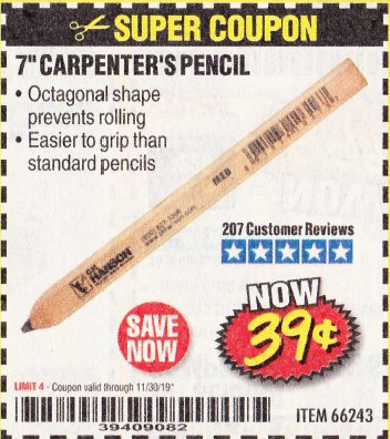 7 IN. CARPENTERS PENCIL Lot No. 66243 Expired: 11/30/19 - $0.39 Coupon Code: '39409082'
