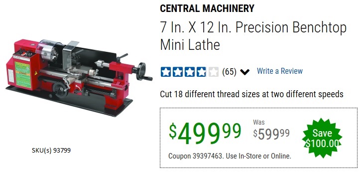 7 IN. X 12 IN. PRECISION BENCHTOP MINI LATHE Lot No. 93799 Expired: 6/30/20 - $499.99 Coupon Code: '93880546'