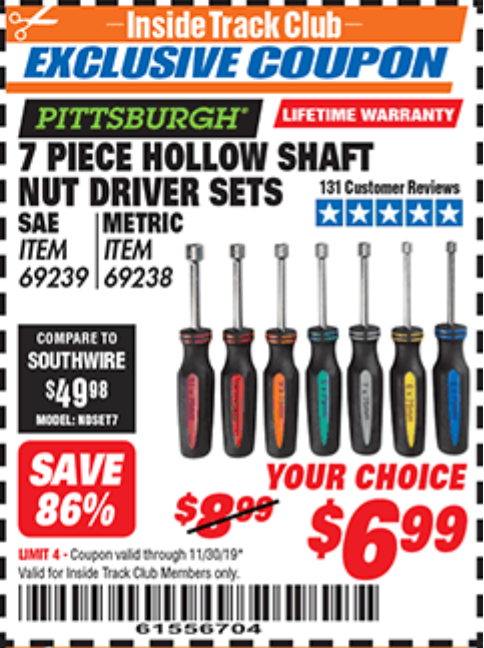 ITC 7 PIECE HOLLOW SHAFT NUT DRIVER SETS Lot No. 69239/69238 Expired: 11/30/19 - $6.99 Coupon Code: '61556704'