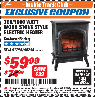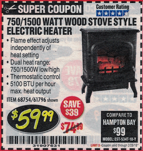750/1500 WATT WOOD STOVE Lot No. 68754 Expired: 1/31/18 - $59.99 Coupon Code: '30511085'