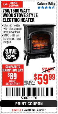 750/1500 WATT WOOD STOVE Lot No. 68754 Expired: 2/3/19 - $59.99 Coupon Code: '53871170'