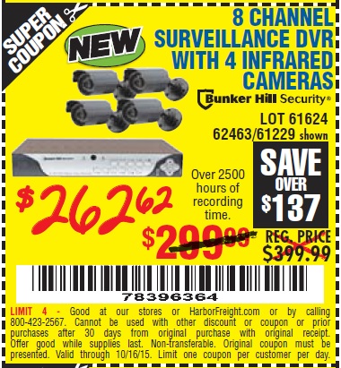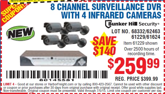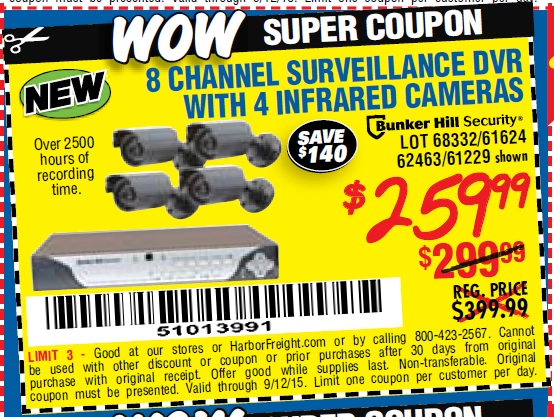 8 CHANNEL SURVEILLANCE DVR WITH 4 INFRARED CAMERAS Lot No. 68332/61229/61624/62463 Expired: 9/12/15 - $259.99 Coupon Code: '51013991'