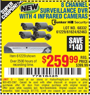 8 CHANNEL SURVEILLANCE DVR WITH 4 INFRARED CAMERAS Lot No. 68332/61229/61624/62463 Expired: 7/17/15 - $259.99 Coupon Code: '67017744'