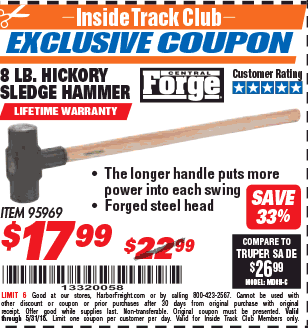 ITC 8 LB. HICKORY SLEDGE HAMMER Lot No. 95969 Expired: 3/31/15 - $17.99 Coupon Code: '71443905'