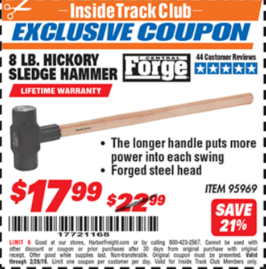 ITC 8 LB. HICKORY SLEDGE HAMMER Lot No. 95969 Expired: 1/28/21 - $17.99 Coupon Code: 'n/a'