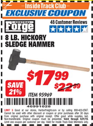 ITC 8 LB. HICKORY SLEDGE HAMMER Lot No. 95969 Expired: 5/31/19 - $17.99 Coupon Code: '46991028'
