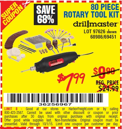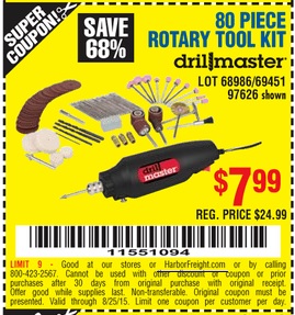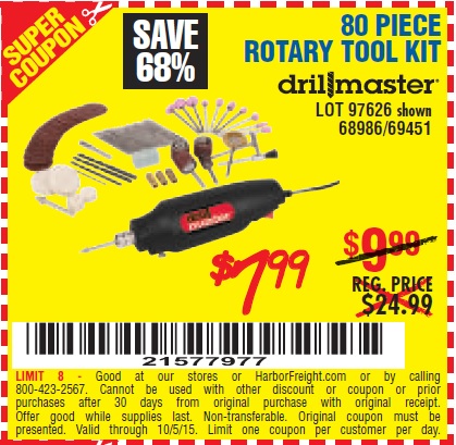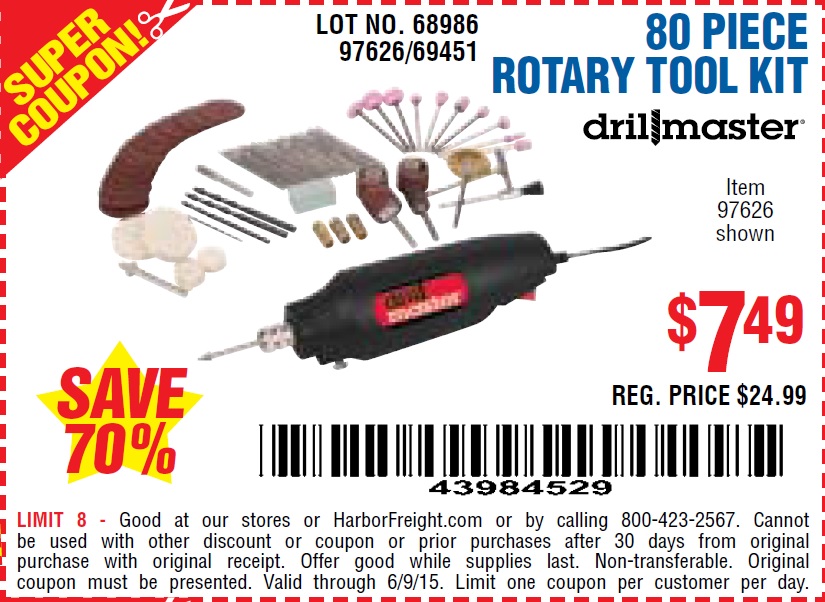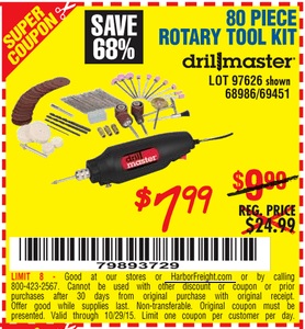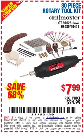80 PIECE ROTARY TOOL KIT Lot No. 68986/97626/63292/63235 Expired: 9/26/15 - $7.99 Coupon Code: '21153129'