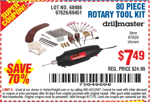 80 PIECE ROTARY TOOL KIT Lot No. 68986/97626/63292/63235 Expired: 6/17/15 - $7.49 Coupon Code: '75048606'