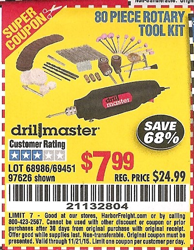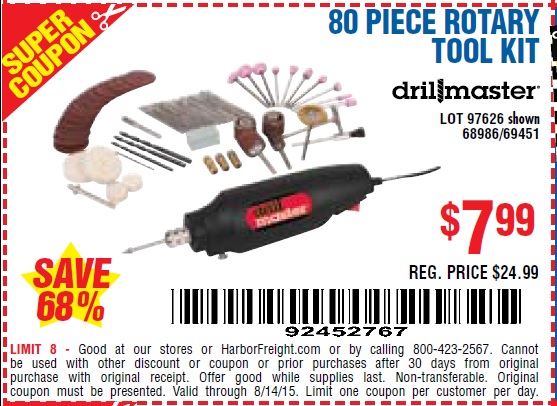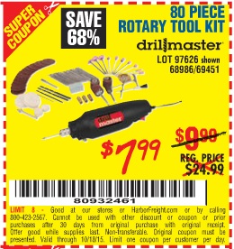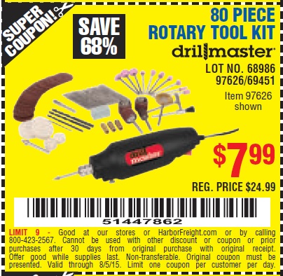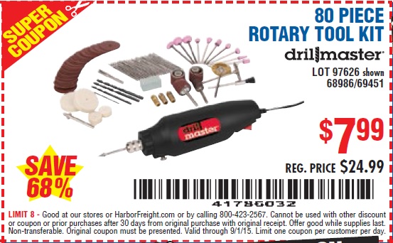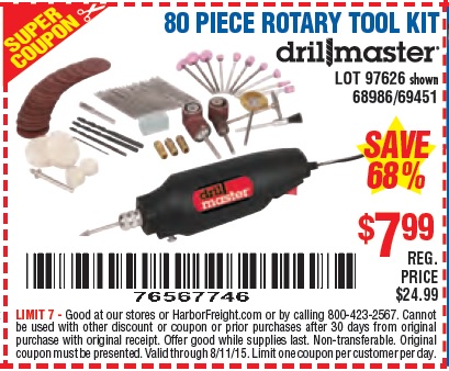 80 PIECE ROTARY TOOL KIT Lot No. 68986/97626/63292/63235 Expired: 7/22/15 - $7.99 Coupon Code: '49801675'