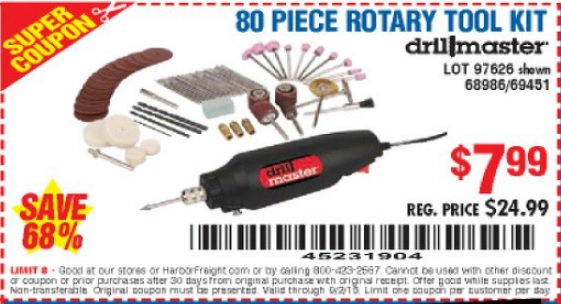 80 PIECE ROTARY TOOL KIT Lot No. 68986/97626/63292/63235 Expired: 9/2/15 - $7.99 Coupon Code: '45231904'