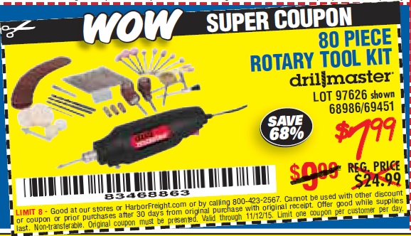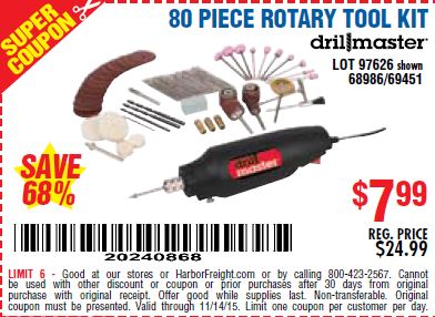 80 PIECE ROTARY TOOL KIT Lot No. 68986/97626/63292/63235 Expired: 11/14/15 - $7.99 Coupon Code: '20240868'
