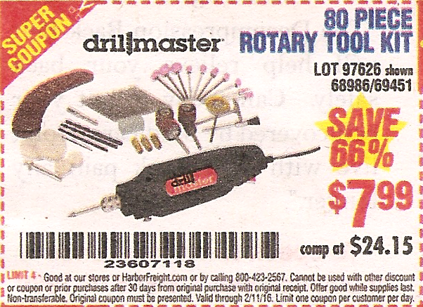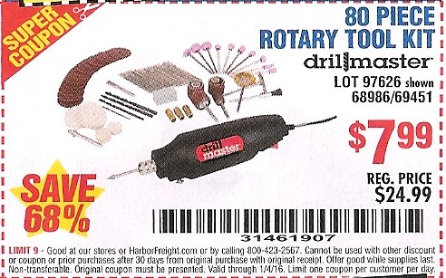 80 PIECE ROTARY TOOL KIT Lot No. 68986/97626/63292/63235 Expired: 2/11/16 - $7.99 Coupon Code: '23607118'