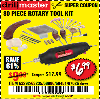 80 PIECE ROTARY TOOL KIT Lot No. 68986/97626/63292/63235 Expired: 2/1/18 - $6.99 Coupon Code: '11399667'