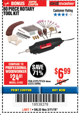 80 PIECE ROTARY TOOL KIT Lot No. 68986/97626/63292/63235 Expired: 3/19/18 - $6.99 Coupon Code: '16960889'