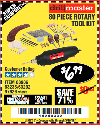 80 PIECE ROTARY TOOL KIT Lot No. 68986/97626/63292/63235 Expired: 5/19/18 - $6.99 Coupon Code: '14240332'