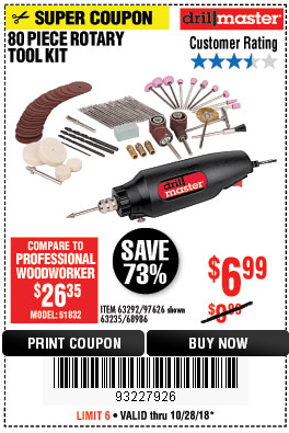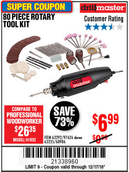 80 PIECE ROTARY TOOL KIT Lot No. 68986/97626/63292/63235 Expired: 9/30/18 - $6.99 Coupon Code: '15514156'