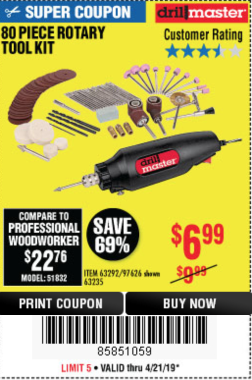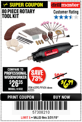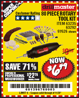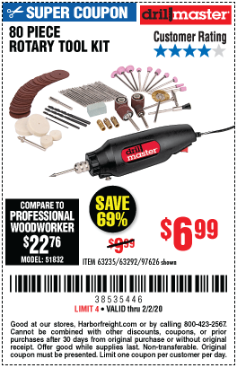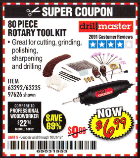 80 PIECE ROTARY TOOL KIT Lot No. 68986/97626/63292/63235 Expired: 3/31/19 - $6.99 Coupon Code: '35345103'