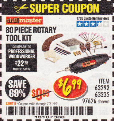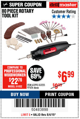 80 PIECE ROTARY TOOL KIT Lot No. 68986/97626/63292/63235 Expired: 7/31/19 - $6.99 Coupon Code: '18187300'