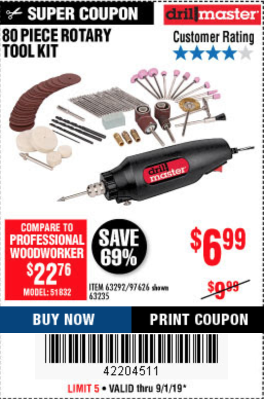 80 PIECE ROTARY TOOL KIT Lot No. 68986/97626/63292/63235 Expired: 9/1/19 - $6.99 Coupon Code: '42204511'