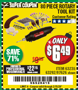 80 PIECE ROTARY TOOL KIT Lot No. 68986/97626/63292/63235 Expired: 2/15/20 - $6.49 Coupon Code: '56520415'