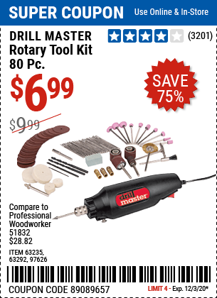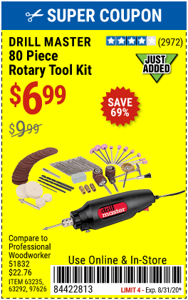 80 PIECE ROTARY TOOL KIT Lot No. 68986/97626/63292/63235 Expired: 7/2/20 - $6.99 Coupon Code: '13124753'