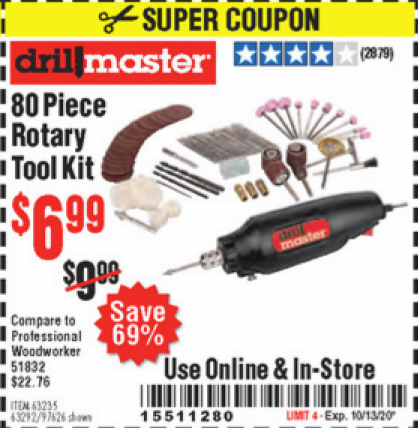 80 PIECE ROTARY TOOL KIT Lot No. 68986/97626/63292/63235 Expired: 9/2/19 - $6.99 Coupon Code: '47507971'