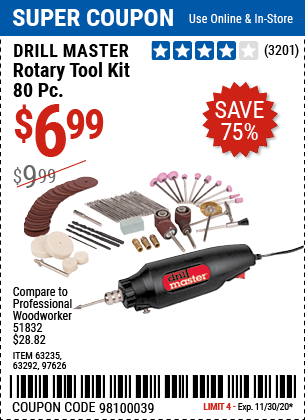 80 PIECE ROTARY TOOL KIT Lot No. 68986/97626/63292/63235 Expired: 11/15/18 - $6.99 Coupon Code: '31107794'