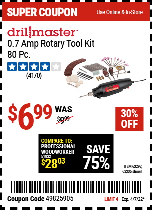 80 PIECE ROTARY TOOL KIT Lot No. 68986/97626/63292/63235 Expired: 4/7/22 - $6.99 Coupon Code: '49825905'