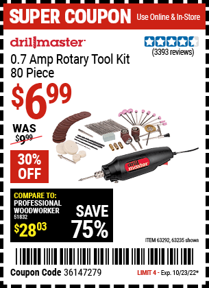 80 PIECE ROTARY TOOL KIT Lot No. 68986/97626/63292/63235 Expired: 10/23/22 - $6.99 Coupon Code: '36147279'