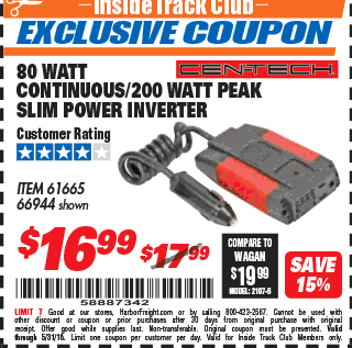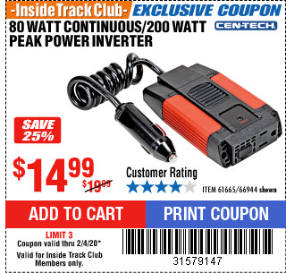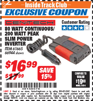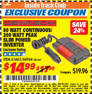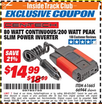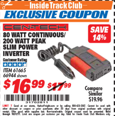 ITC 80 WATT CONTINUOUS / 200 WATT PEAK SLIM POWER INVERTER Lot No. 61665/66944 Expired: 10/31/17 - $16.99 Coupon Code: '31702811'