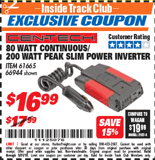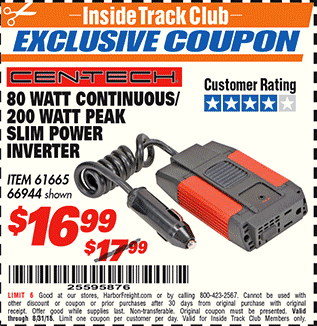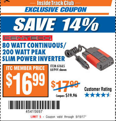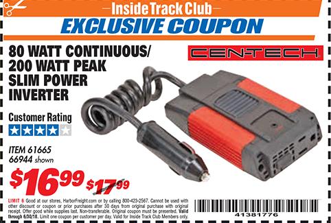 ITC 80 WATT CONTINUOUS / 200 WATT PEAK SLIM POWER INVERTER Lot No. 61665/66944 Expired: 8/31/17 - $14.99 Coupon Code: '79960570'