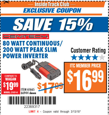 ITC 80 WATT CONTINUOUS / 200 WATT PEAK SLIM POWER INVERTER Lot No. 61665/66944 Expired: 2/13/18 - $16.99 Coupon Code: '22369317'