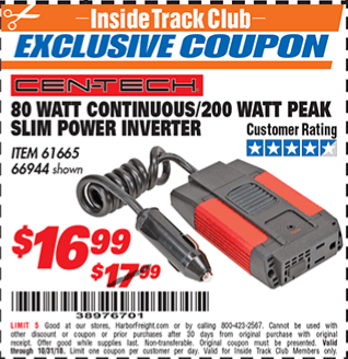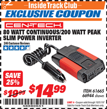 ITC 80 WATT CONTINUOUS / 200 WATT PEAK SLIM POWER INVERTER Lot No. 61665/66944 Expired: 10/31/18 - $16.99 Coupon Code: '38976701'