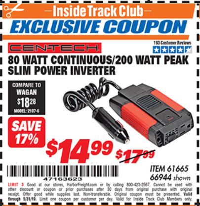 ITC 80 WATT CONTINUOUS / 200 WATT PEAK SLIM POWER INVERTER Lot No. 61665/66944 Expired: 5/31/19 - $14.99 Coupon Code: '47163623'