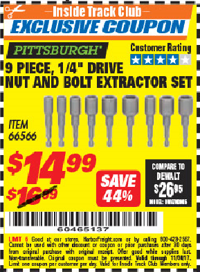 ITC 9 PIECE, 1/4" DRIVE NUT AND BOLT EXTRACTOR SET Lot No. 66566 Expired: 11/30/17 - $14.99 Coupon Code: '60465137'